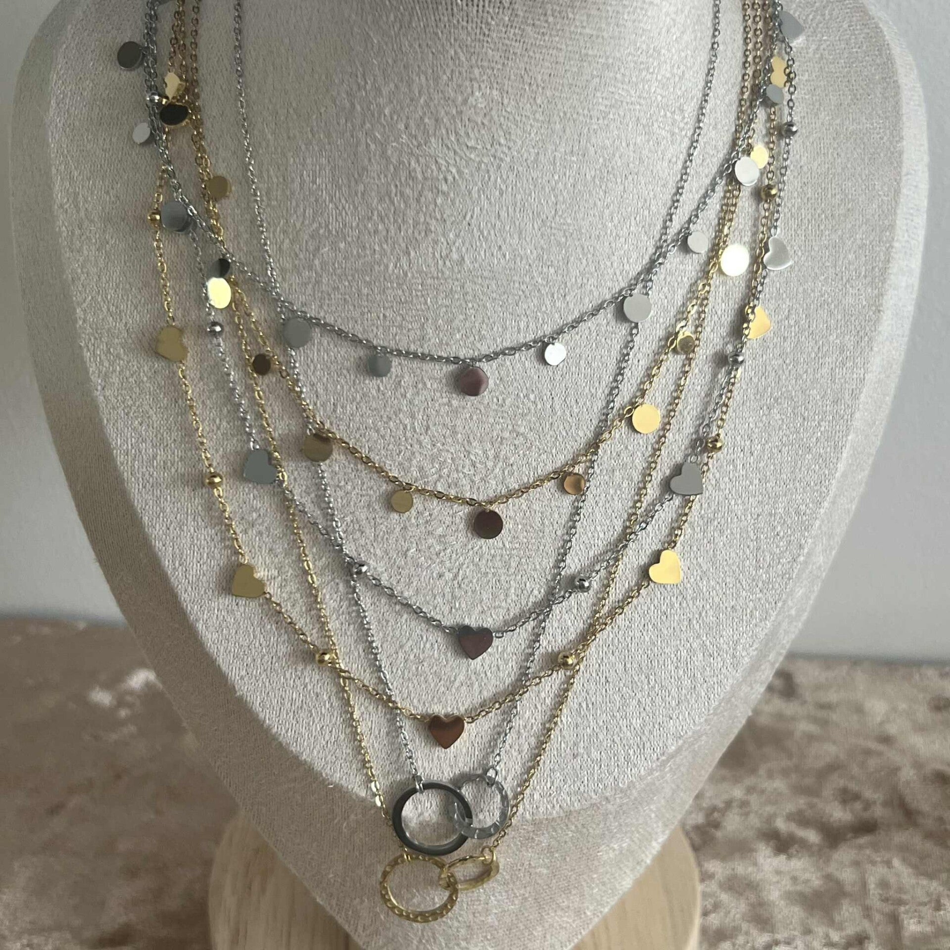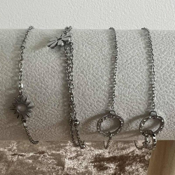 Faites le choix entre les différents bijoux et leur couleur : bracelet, collier, boucles d'oreille / doré ou argenté.